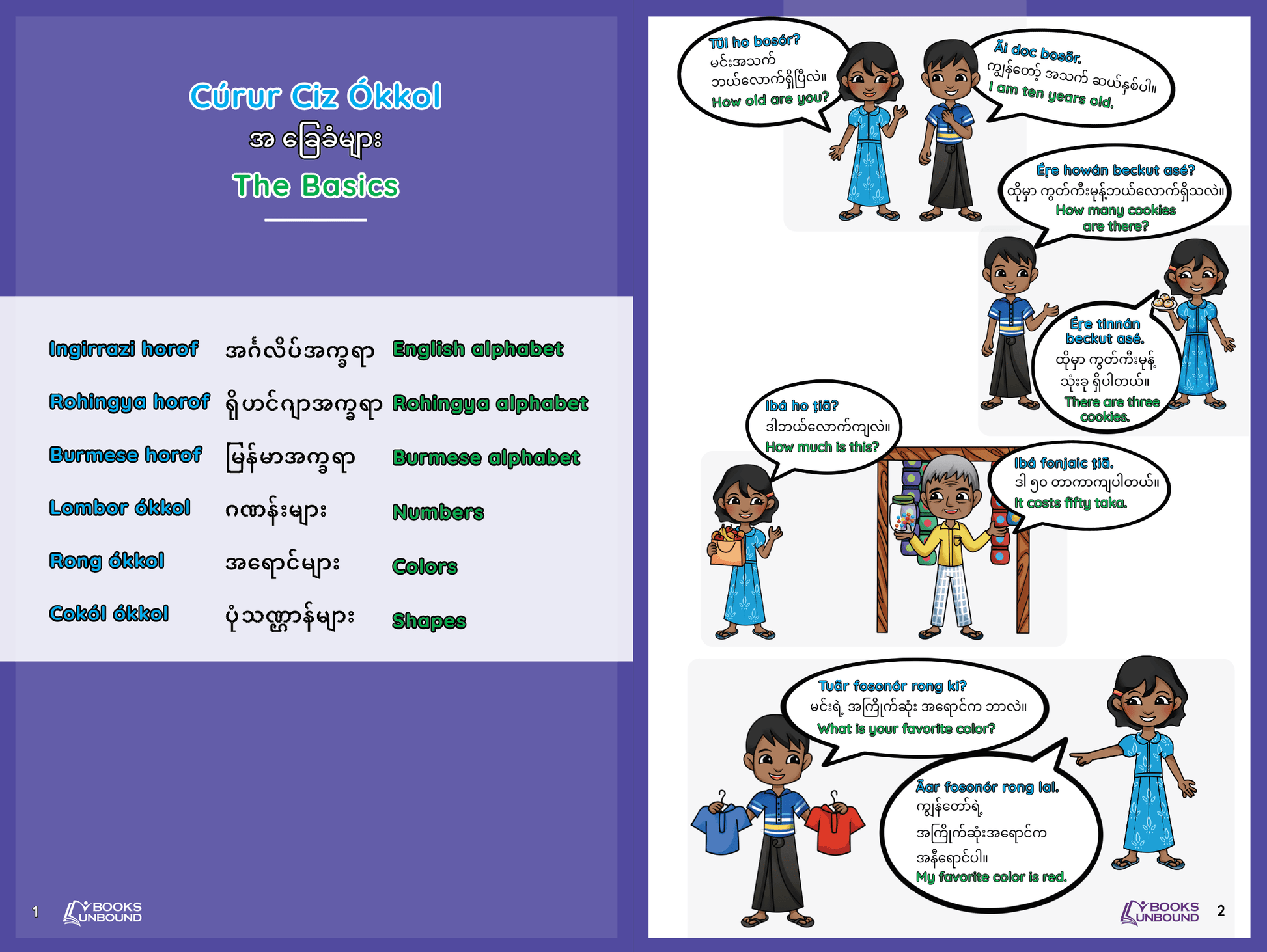 The first-ever Rohingya Picture Dictionary in written Rohingya, English, and Burmese, with culturally sensitive cartoons modeled after real people designed to represent the Rohingya culture. The product is designed for Rohingya children and adults in Asia in need of language resources.