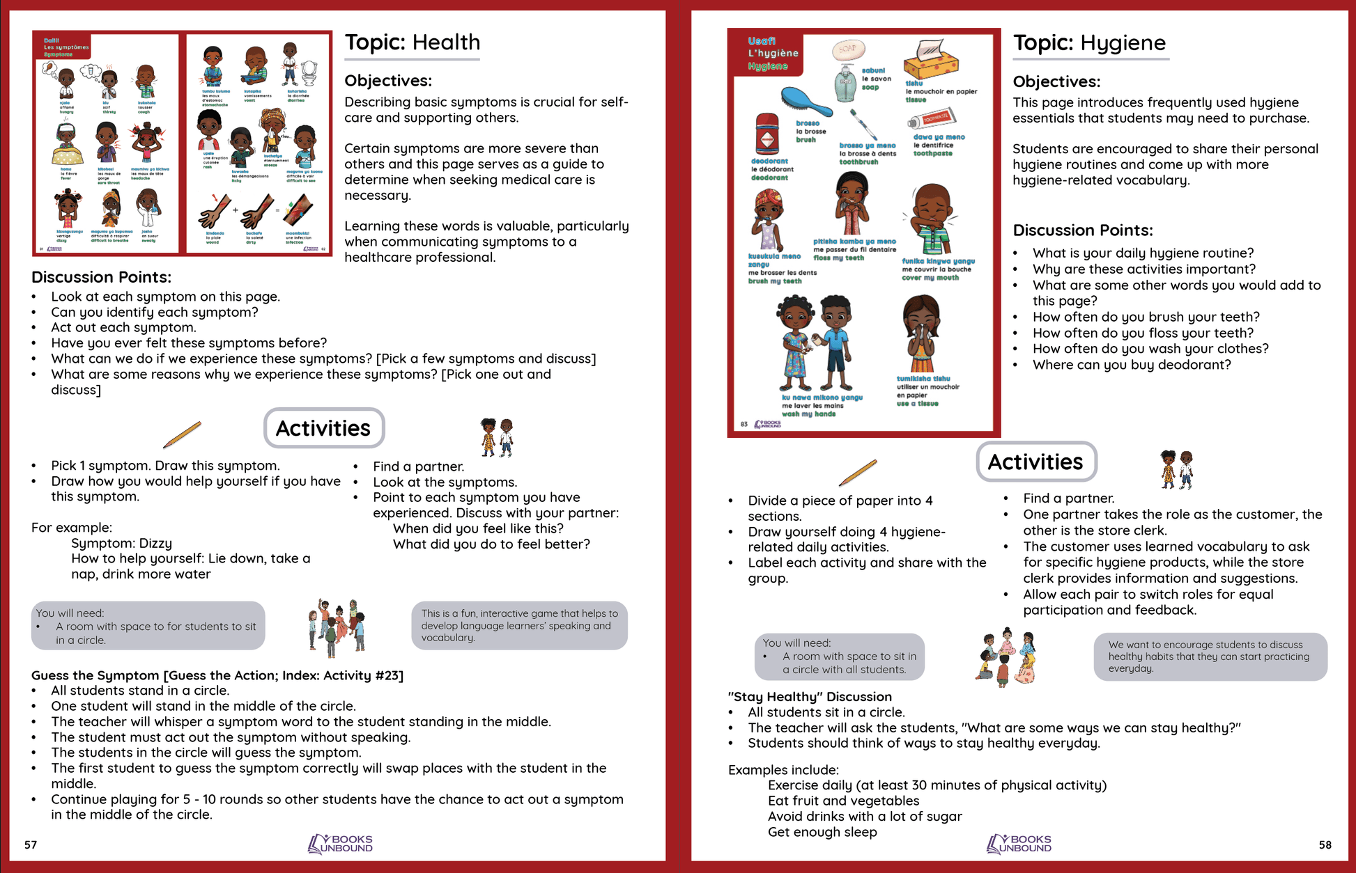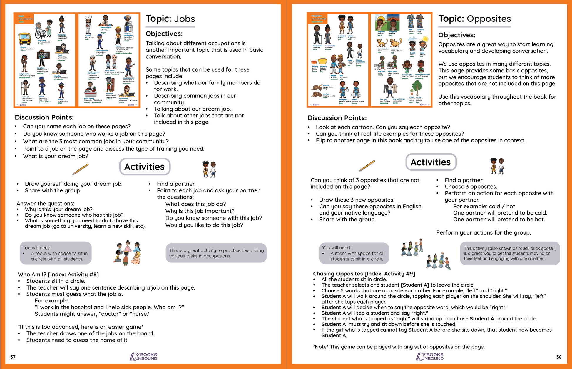 Each page includes recommended topics, learning objectives, discussion points, and activities [drawing activity, partner activity, and group activity]. We also have an index of 30+ recommended activities that can be applied throughout any section in the book.