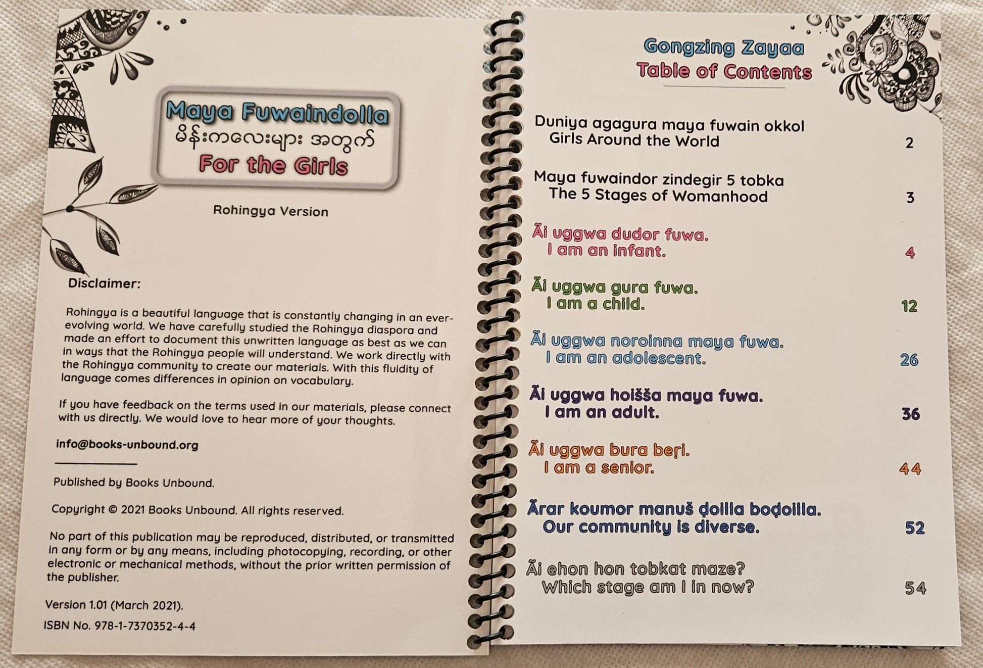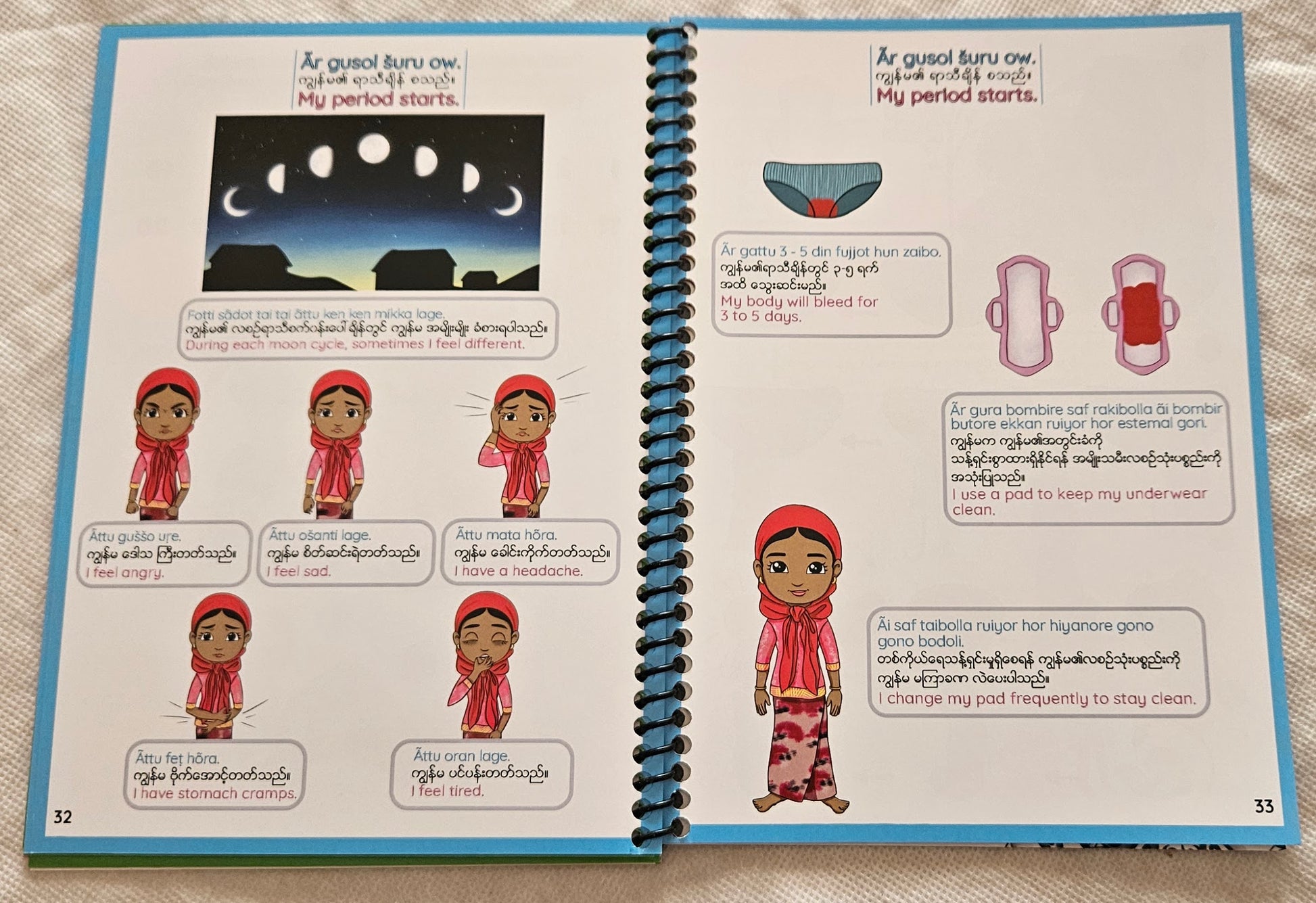The pilot version and first print-run of our Rohingya Girls' Book - a women's health book designed for Rohingya adolescent girls.