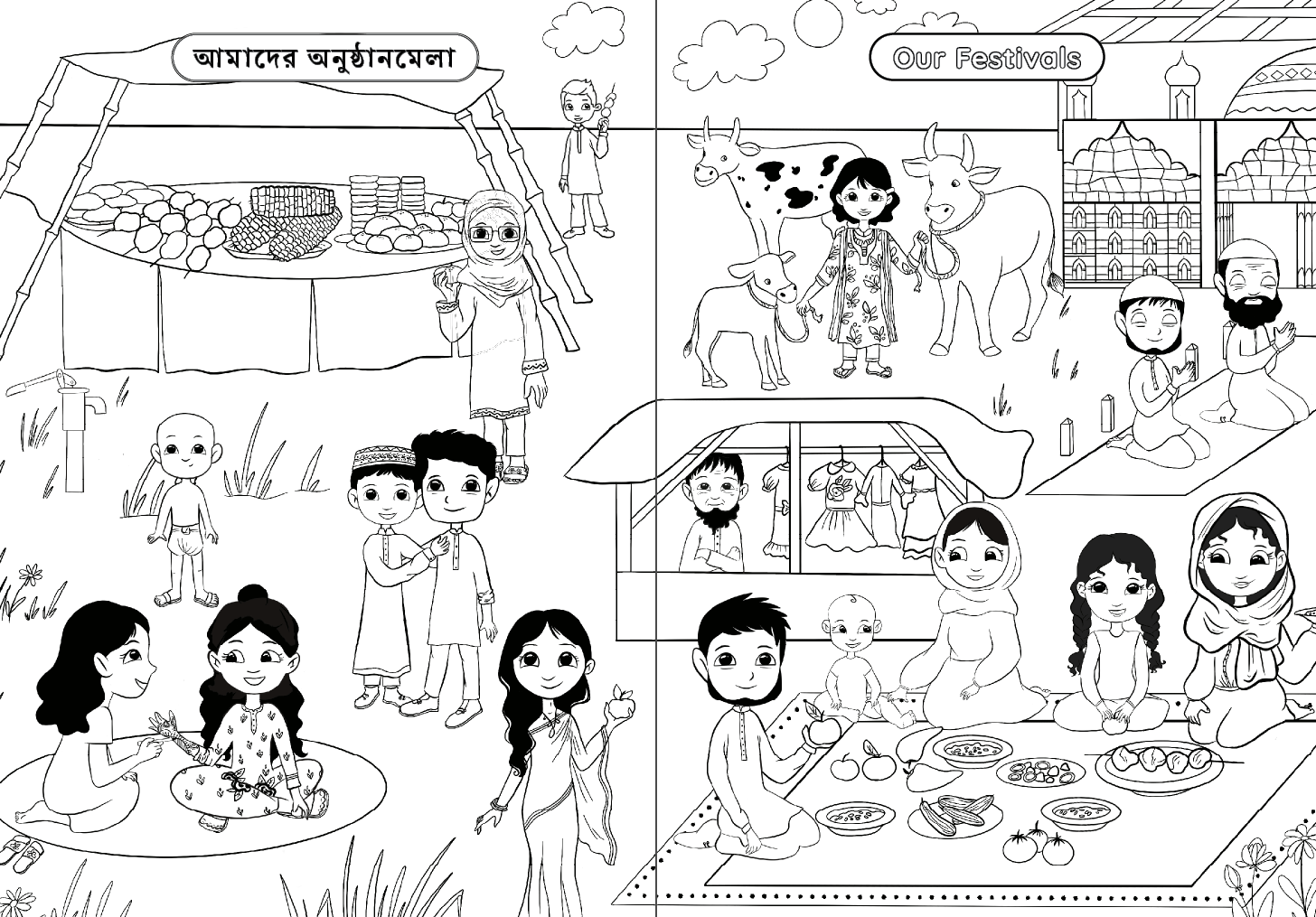 Number of pages: 26 coloring pages with contextualized scenes of life in the Bangla community