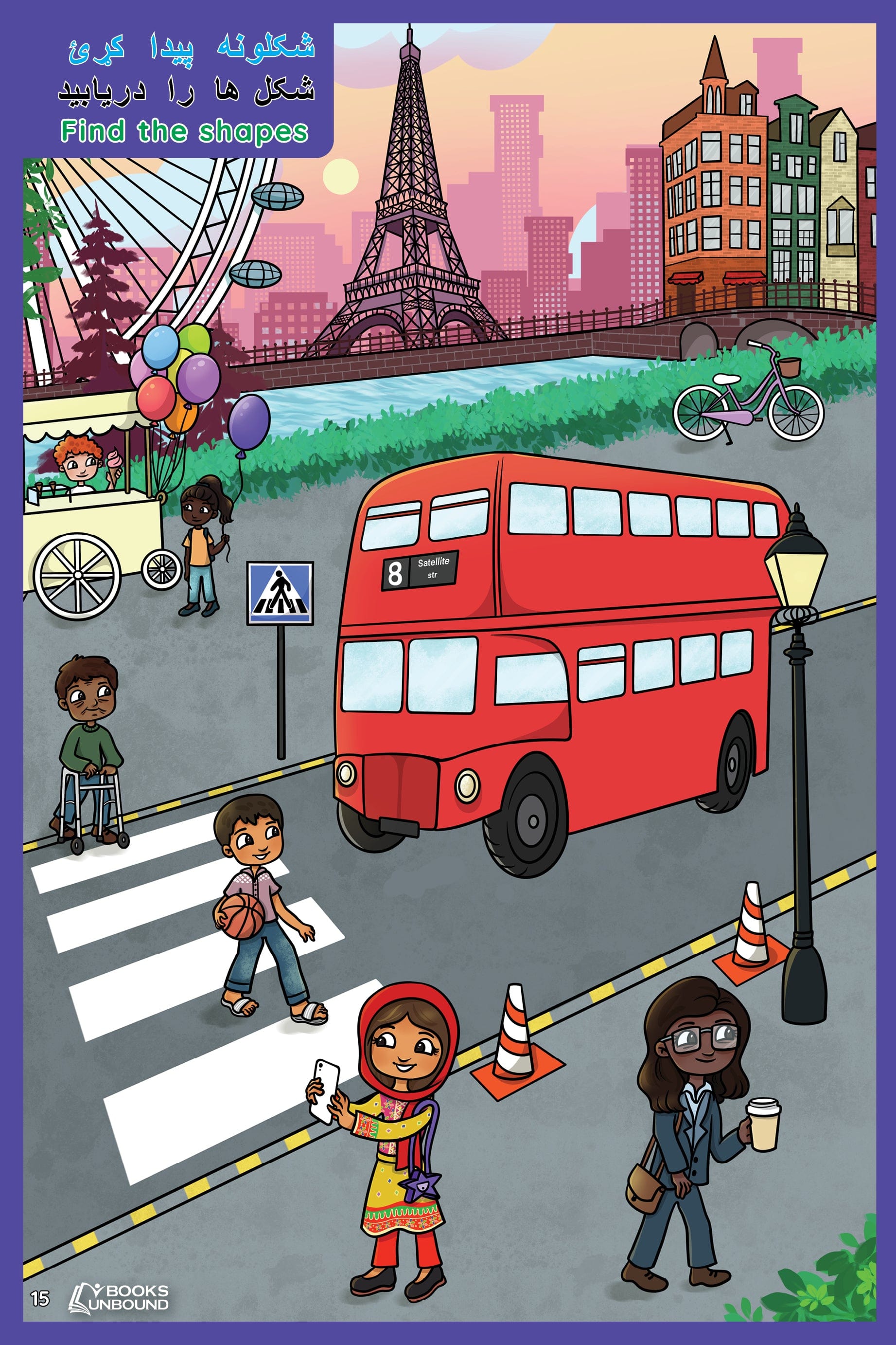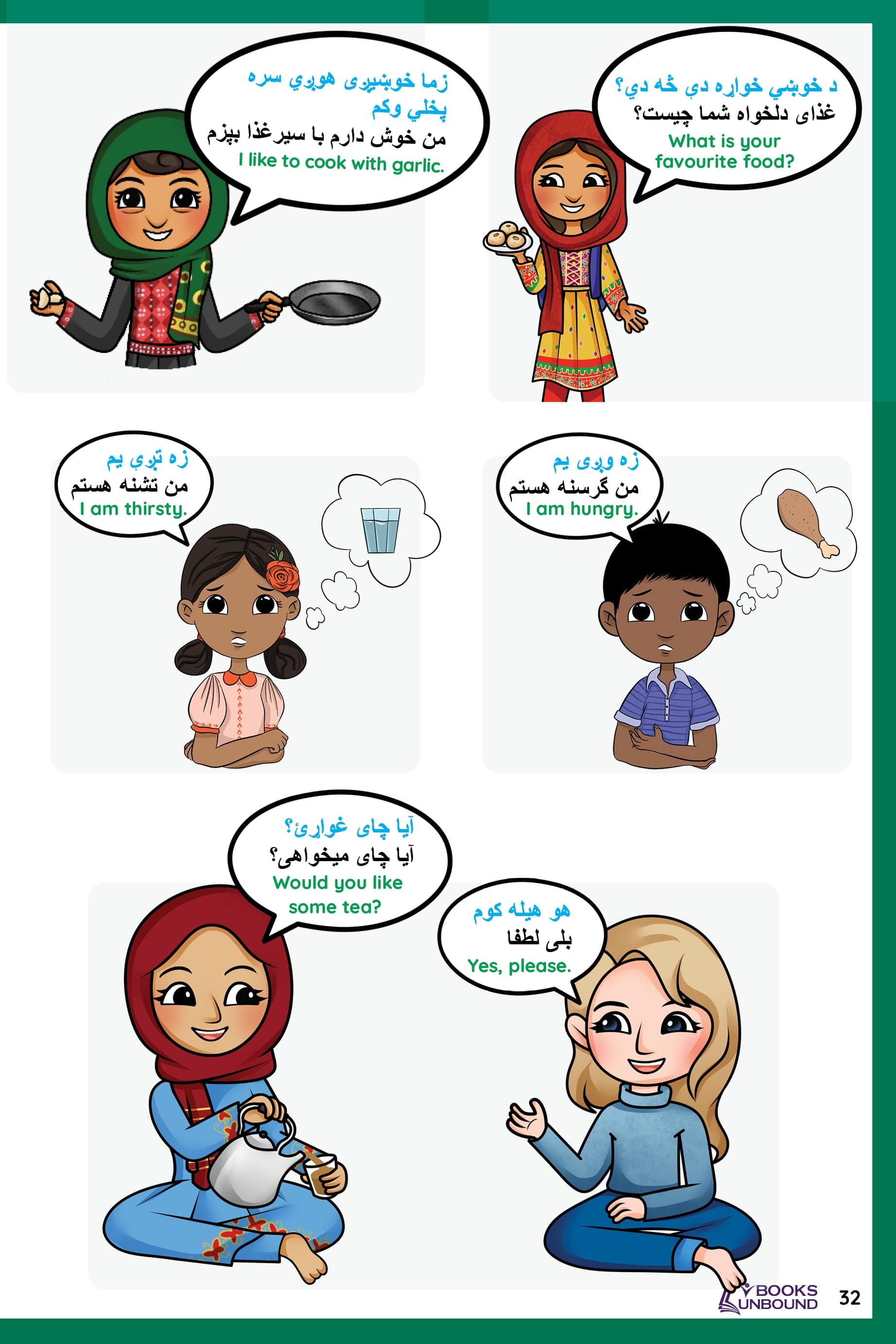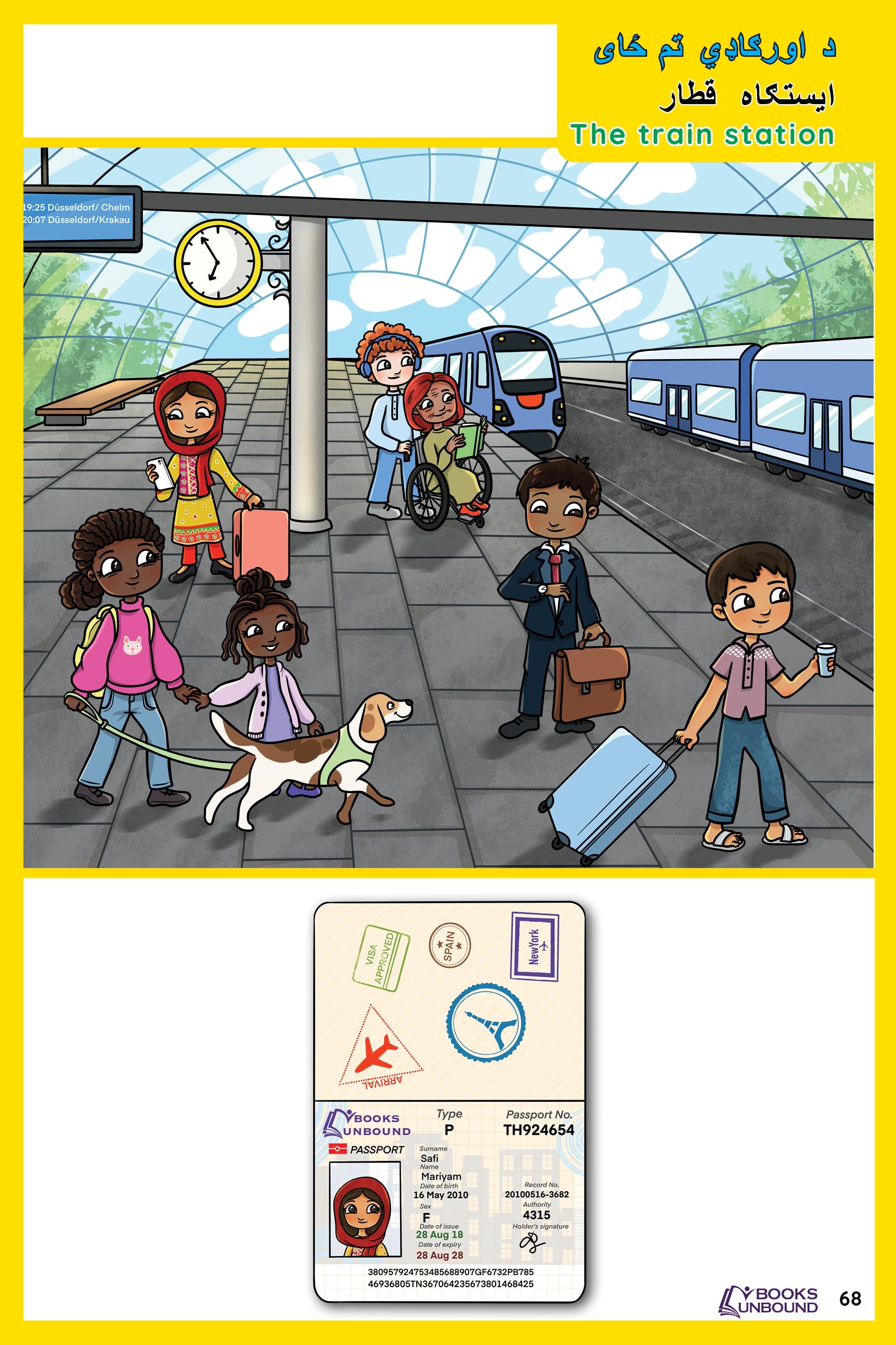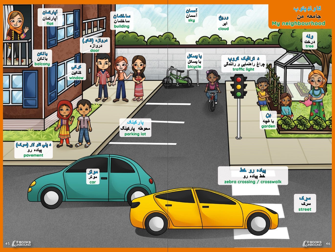 The scenes are contextualized to match scenes in European countries that are welcoming Afghan refugees. The featured currency is in Euros and the English descriptions are in conversational British English. If you're looking for an American English version, check out our "Afghan Picture Dictionary | USA Version."
