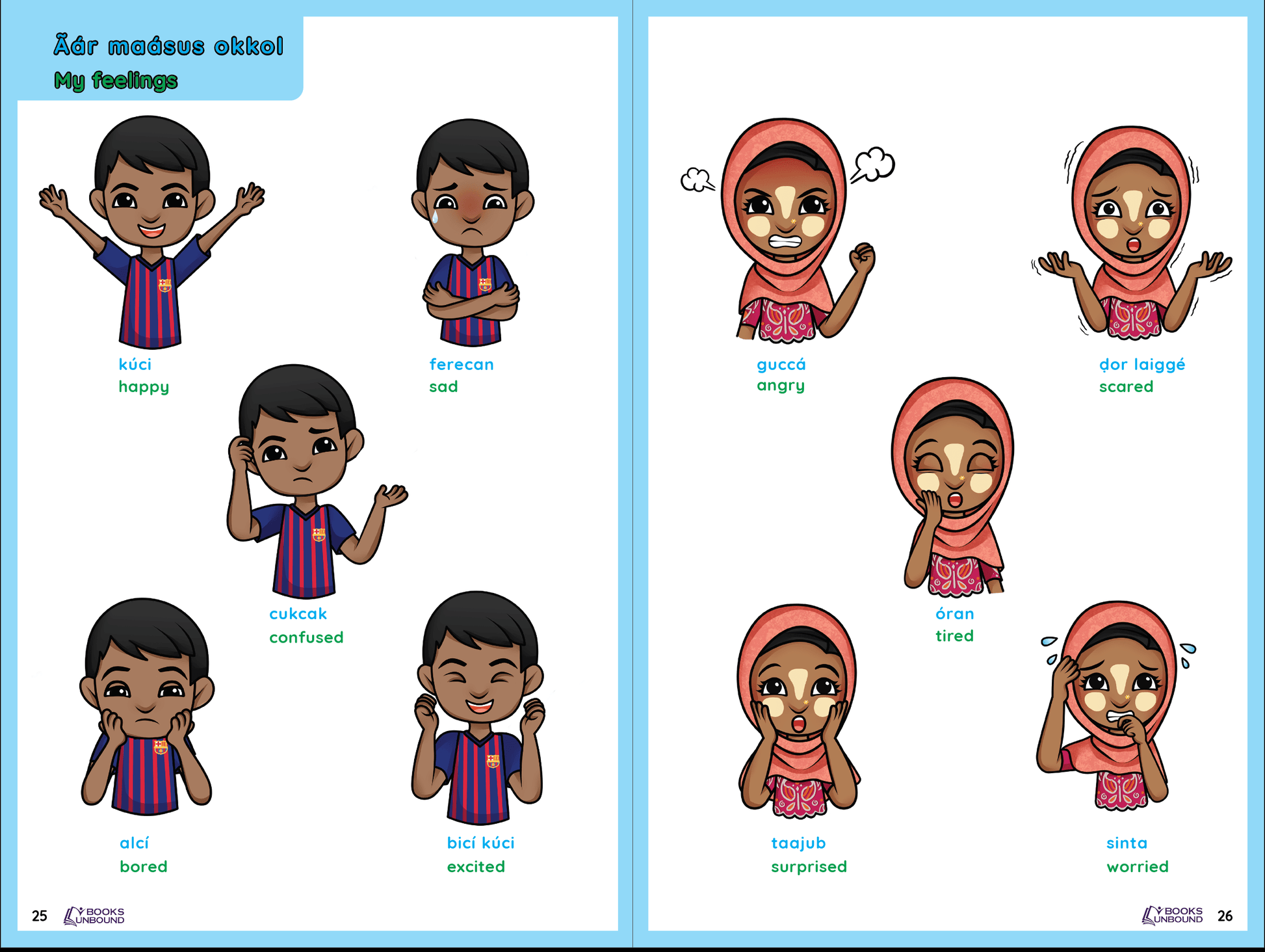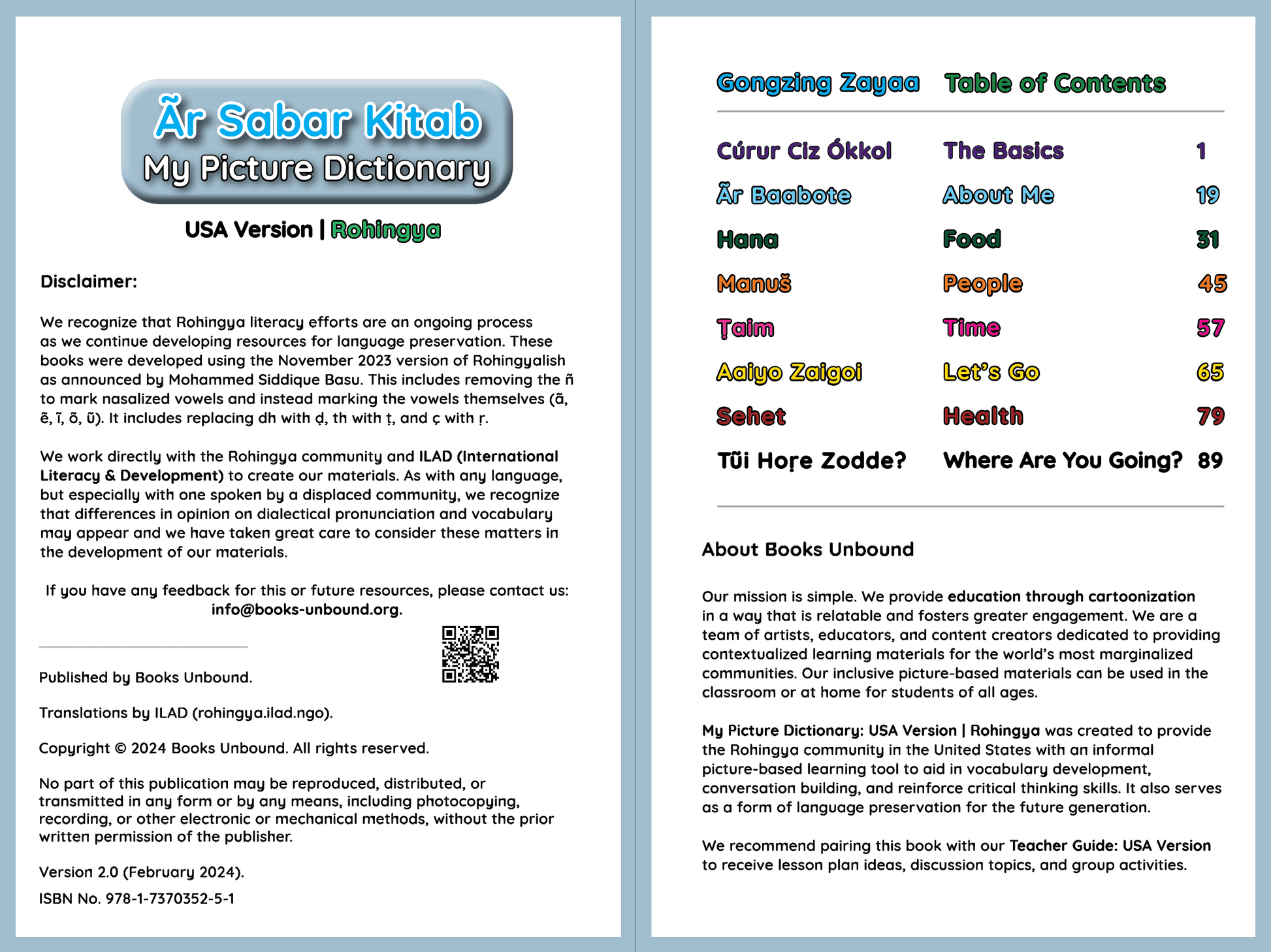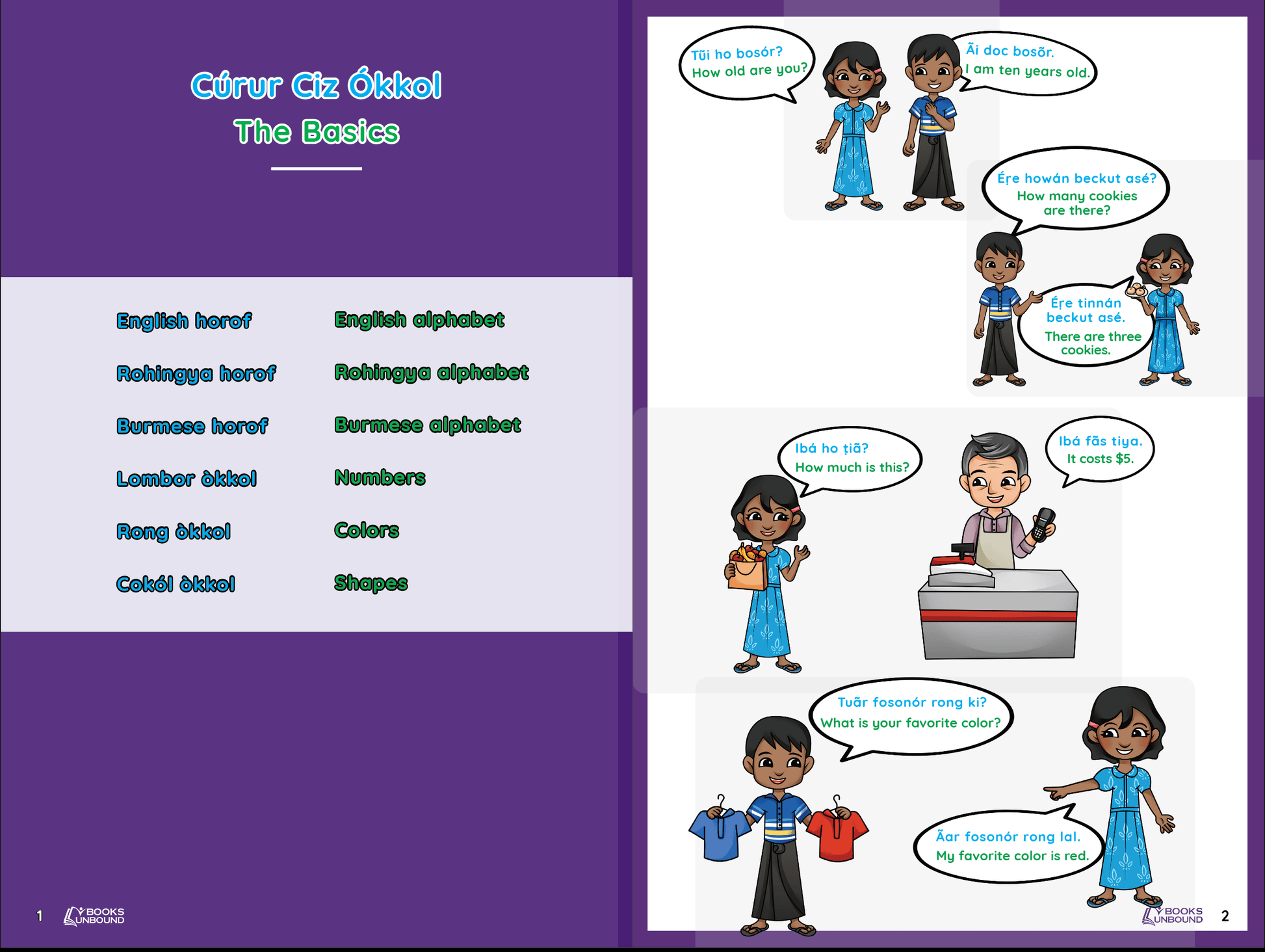 The book contains 90 pages of vibrant full-color illustrations, delving into 7 introductory conversational topics in both Rohingya and English. Whether used formally in classrooms or informally at home, this book fosters a sense of familiarity and belonging through relatable cartoons.