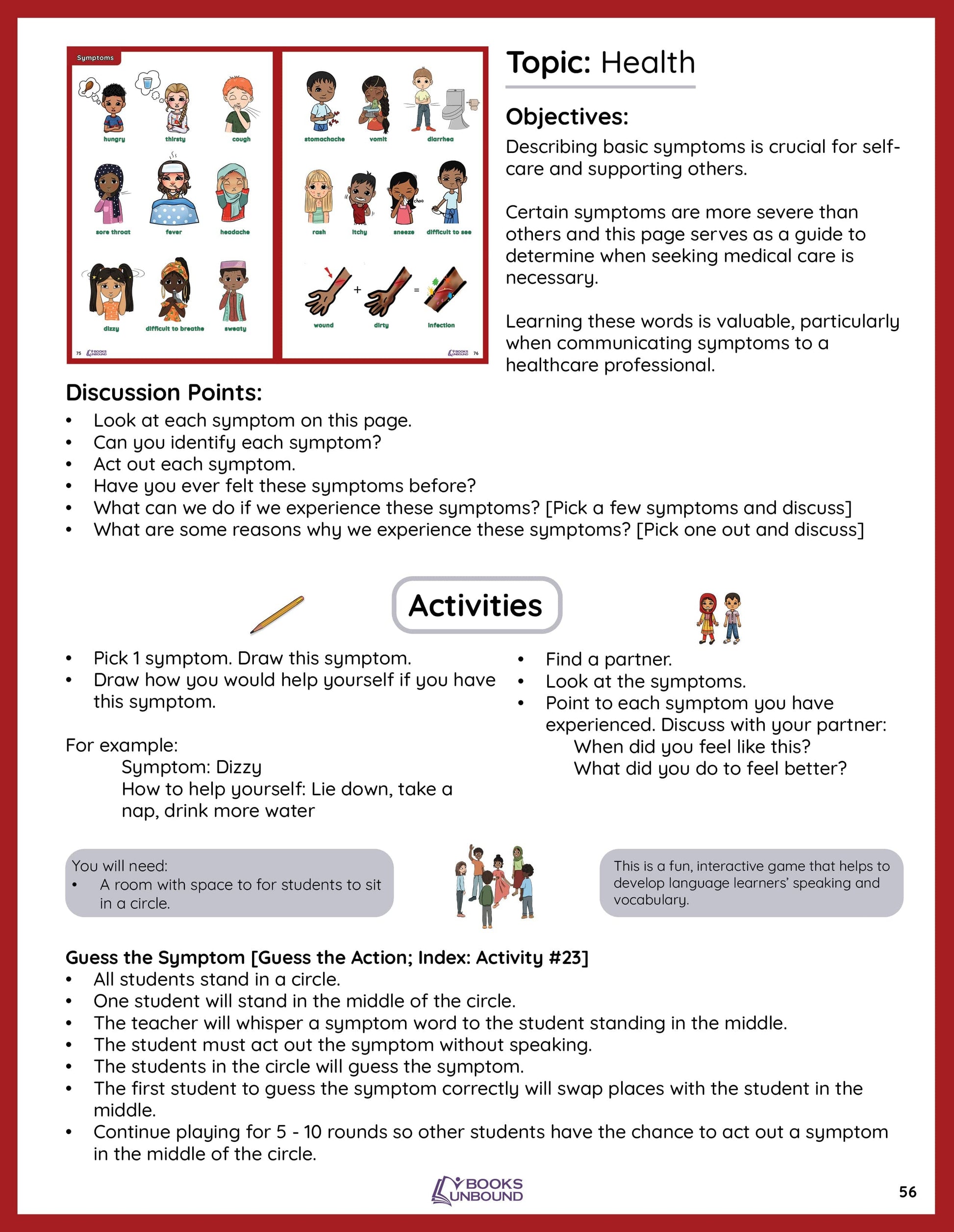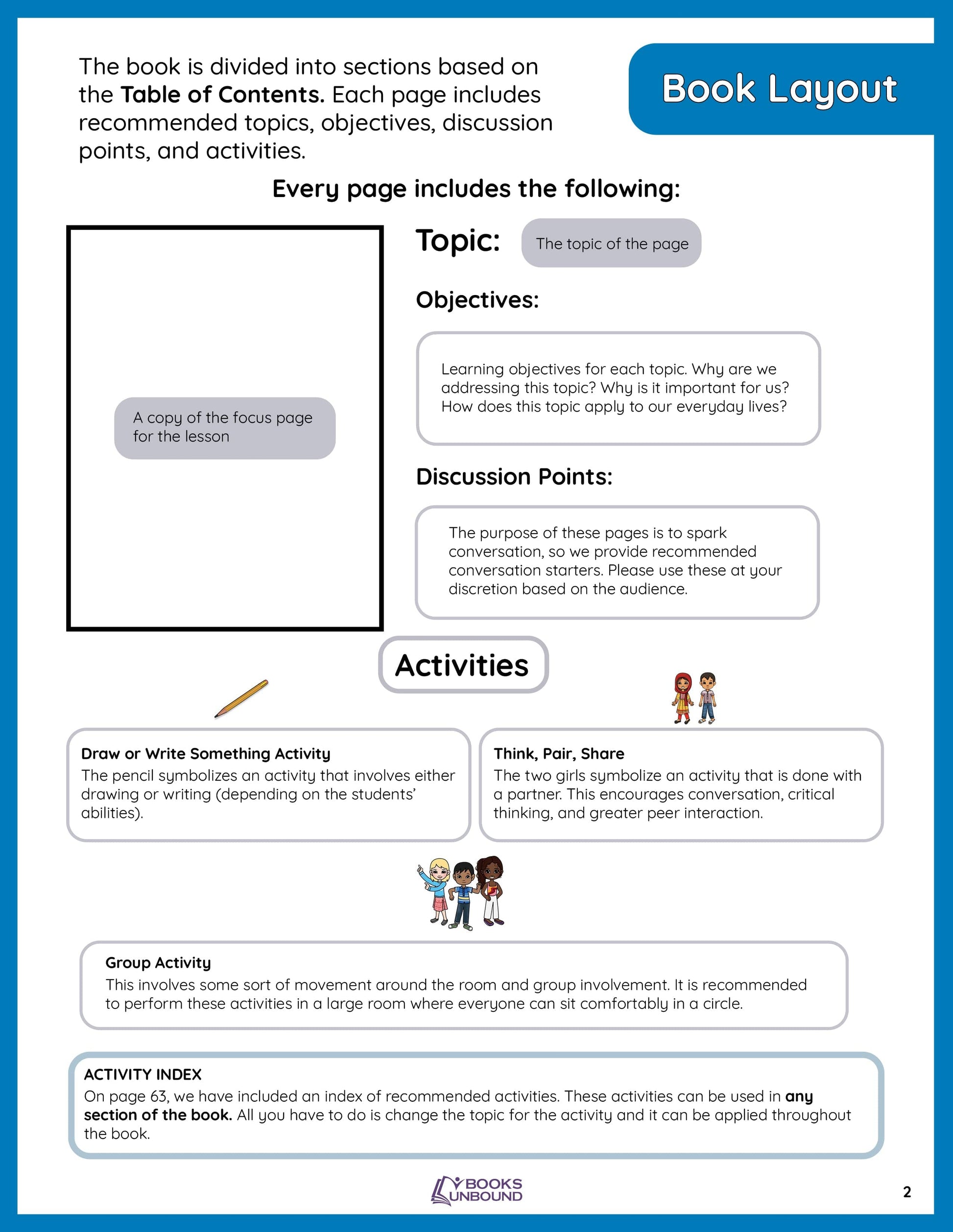 Each page includes recommended topics, learning objectives, discussion points, and activities [drawing activity, partner activity, and group activity]. We also have an index of 30+ recommended activities that can be applied throughout any section in the book.